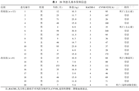| 组别 | 患儿编号 | 性别 | 年龄(月) | 体重(kg) | RACHS-1 | CVVH时间(h) | 转归 |