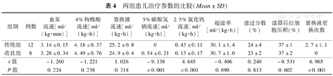 两组患儿的血泵流速、枸橼酸、置换液流速、超滤率、稀释分数和滤器后HCT差异均无统计学意义(P>0.05)。传统组需2.5%氯化钙持续泵入,平均泵速为0.43 ml/(kg·h),改良组平均泵速为0.13 ml/(kg·h),明显低于传统组。治疗期间,碳酸氢钠异常时,传统组需要调整置换液配方,平均次数为(2.7±1.1)次/例。改良组仅需调整碳酸氢钠的走速,无需更换置换液配方。见表4。