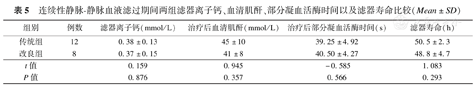 | 组别 | 例数 | 滤器离子钙(mmol/L) | 治疗后血清肌酐(mmol/L) | 治疗后部分凝血活酶时间(s) | 滤器寿命(h) |