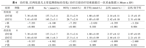 改良组:含钙置换液与商用青山利康配方含钙置换液成分一致,成分如下:Na+:113 mmol/L,K+:3.3 mmol/L,Cl- 119 mmol/L,Mg2+:0.8 mmol/L,Ca2+:1.6 mmol/L,葡萄糖:10.6 mmol/L。5%碳酸氢钠由微量泵在回血端泵入,5%碳酸氢钠初始速率(QSB)=0.01×QREPLA(ml/h),根据血气调整QSB。上机后2 h内,静脉注射2.5%氯化钙0.4 ml/kg,每小时1次×2次,此后,根据需要间歇或连续静脉注射2.5%氯化钙注射液,保持血浆离子钙水平在1.0 mmol/L以上。治疗期间纠正代谢性酸中毒或碱中毒。
