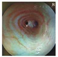 隆突结构畸形,气管在隆突水平分为左右两支,左侧开口狭窄,图中箭头所示为显著狭窄的桥支气管开口。