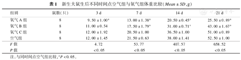 新生大鼠生后不同时间点空气组与氧气组体重比较(Mean±SD,g)