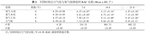 空气组新生大鼠RAC随日龄呈增加趋势。与同日龄空气组比较,氧气A组从第7天开始下降,并持续至21 d(P<0.05)。氧气B组随日龄增长,RAC逐渐升高,但升高不明显,生后第7、14天和21天差别不大,与各时间点空气组相比,差异有统计学意义(P<0.05)。氧气C组随日龄增长,RAC逐渐升高,并且升高明显,生后第3天和第7天与同日龄空气组相比,差异无统计学意义(P>0.05),在生后第14天和第21天与空气组相比,差异有统计学意义(P<0.05),见表2。