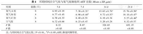 不同时间点空气组与氧气组肺组织AST比较(Mean±SD,μm)