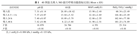 40例患儿吸入NO前后呼吸功能指标比较(Mean±SD)