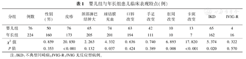 | 分组 | 例数 | 性别(男) | 皮疹 | 颈部淋巴结肿大 | 球结膜充血 | 口唇改变 | 手足改变 | 肛周改变 | 卡斑改变 | IKD | IVIG-R |