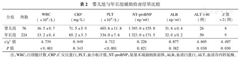 | 分组 | 例数 | WBC(×109/L) | CRP(mg/L) | PLT(×109/L) | NT-proBNP(ng/ml) | ALB(ng/ml) | ALT>40(例) | Z值>2(例) |