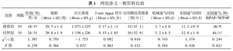 两组患儿在性别、胎龄、出生体重、孕母产前是否应用糖皮质激素、Apgar评分等方面比较,差异无统计学意义(P>0.05),具有可比性。在有创机械通气时间、无创通气模式及时间方面比较差异无统计学意义(P>0.05),见表1。