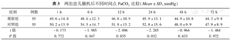两组患儿在撤机后6 h、12 h、24 h的血气PaCO2观察组低于对照组,差异有统计学意义(P<0.05),在1 h、48 h、72 h两组间PaCO2差异无统计学意义(P>0.05),见表3。