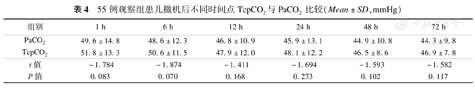 55例观察组患儿撤机后不同时间点TcpCO2与PaCO2比较(Mean±SD,mmHg)