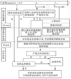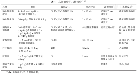 胰岛素加葡萄糖可刺激细胞摄取葡萄糖的同时,将钾离子泵入细胞内,降低血清钾浓度。如有高血糖,可单用胰岛素。使用胰岛素葡萄糖1 h后,低血糖风险增加,应每小时监测血糖,直至停用胰岛素后6 h[7]。