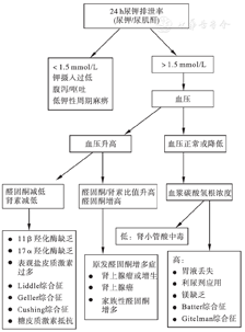 多数患儿可根据病史、24 h尿钾排泄率、血气分析等初步判断低钾血症原因。评估尿钾排泄可区分低钾血症是肾脏失钾过多,还是肾外因素。24 h尿钾/尿肌酐比值>1.5,考虑肾脏失钾致低钾血症。血气分析有助于区分低钾病因,血清肾素及醛固酮水平有助于区分内分泌性低钾血症[14],见图2。