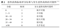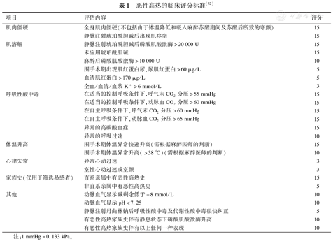 另外,儿童恶性高热发病率高于成人;临床上针对恶性高热有相应的评分标准,以及根据评分结果提示发生恶性高热的可能性[32,33],见表1和表2。