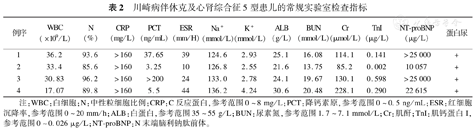 | 例序 | WBC(×109/L) | N(%) | CRP(mg/L) | PCT(ng/mL) | ESR(mm/H) | Na+(mmol/L) | K+(mmol/L) | ALB(g/L) | BUN(mmol/L) | Cr(μmol/L) | TnI(μg/L) | NT-proBNP(μg/L) | 蛋白尿 |