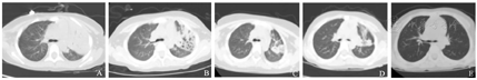 患儿,男,4岁,A :入院时胸部CT示左肺肺炎并肺不张、胸腔积液;B:入院后1周胸部CT示左肺大片状、斑片状密度增高影,可见支气管充气征及多发小囊泡状透亮影,部分支气管扩张,予可弯曲支气管镜术治疗;C:出院后1个月胸部CT示肺炎吸收期,胸腔积液已吸收,左侧背部胸膜局部略厚,肺囊泡影较前基本好转;D:出院后3个月胸部CT示肺炎吸收期,肺囊泡影已消失;E:出院后6个月胸部CT示肺炎已吸收。