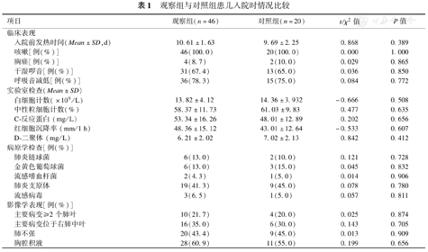 两组患儿入院时发热时间、咳嗽、胸痛、肺部干湿啰音等临床表现,差异无统计学意义(P>0.05)。两组患儿入院时白细胞计数、C反应蛋白、D-二聚体等实验室指标,差异无统计学意义(P>0.05)。两组患儿病原检出阳性率及种类,差异无统计学意义(P>0.05)。两组患儿病变部位≥2个肺叶、病变位于右肺中叶、合并胸腔积液、合并肺不张影像学表现,差异无统计学意义(P>0.05)。见表1。