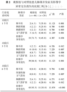 | 门诊复查时间 | 肺部并发症 | 观察组(n=46) | 对照组(n=20) | χ2值 | P值 |