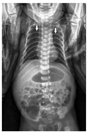 入院查体:体重3 160 g,面容特殊,嘴窄,神志清,弹足后哭声弱,呼吸促,呼吸频率62次/min,心脏查体无异常,无腹胀,无肝脾大,下肢肌张力正常,上肢肌张力减低,觅食、拥抱及握持反射不能引出。辅助检查:血常规:WBC 3.0×109/L,中性粒细胞绝对值0.5×109/L,红细胞2.3×1012/L,血红蛋白86 g/L,平均红细胞体积108 fL,血小板112×109/L;便常规未见脂肪球;肝功能:转氨酶正常;血淀粉酶7 U/L,脂肪酶4.5 U/L;免疫球蛋白定量及淋巴细胞绝对计数均正常。骨髓象增生重度减低。X线胸片可见胸廓较窄,后肋骨向下弯曲明显,呈弓状(图1);脊柱正位片未见异常,双下肢长骨干骺端未见明显异常。
