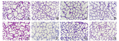 将3 μm石蜡切片脱蜡后进行HE染色,在光学显微镜下观察。每组于4个时间点分别选取8张组织切片用于组织形态学分析。从呼吸性细支气管中心至最近纤维隔(或胸膜)引一条垂线,该垂线上的肺泡个数即为RAC值[9]。