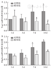 A.Tug1的组织表达;B.Pdgfra的mRNA组织表达;与对照组比较,aP<0.05;与同组1 d比较,bP<0.05; Tug1:长链非编码RNA牛磺酸上调基因1;Pdgfra:血小板源性生长因子受体α。
