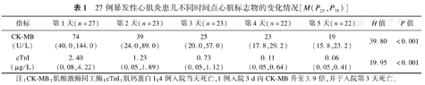 注:CK-MB:肌酸激酶同工酶;cTnI:肌钙蛋白I;4例入院当天死亡,1例入院3 d内CK-MB升至3.9倍,并于入院第3天死亡。