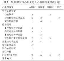 24例FM患儿行胸部X线检查,13例(54.2%)心胸比>0.55,最大心胸比0.71;伴有胸腔积液和肺炎各9例(37.5%),1例(4.2%)心包积液。28例FM患儿入院时均行十二导联心电图检查,其中21例(75.0%)有心律失常。入院后出现致命性室性心律失常5例,其中3例为心室颤动;高度或Ⅲ°房室传导阻滞4例;广泛ST-T改变6例,其中3例为心肌梗死样心电图改变。经有效治疗后,除9例死亡外,9例心电图仍异常(表2)。除1例入院时死亡外,27例FM患儿均行超声心动图动态观察,21例(77.8%)表现为左心室室壁运动减低,10例(37.0%)心室扩大,10例(37.0%)二尖瓣反流,心肌肥厚和心包积液各4例(14.8%),肺动脉高压1例(3.7%);入院第1天左室射血分数(LVEF)为(43.26±14.57)%,左室短轴缩短率(LVFS)为21%(15%,28%);存活者出院前复查LVEF为63%(60%,64%),LVFS为33%(31%,34%)。