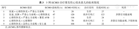 | 4 | 心源性休克+心脏骤停 | 3 | 70 | 放弃后死亡 | 3 | 多器官功能衰竭、下肢栓塞 |