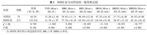 POTS组217例,男115例,女102例,平均年龄(11.70±1.97)岁;对照组73例,男43例,女30例,平均年龄(11.19±2.10)岁。两组间性别及年龄比较差异无统计学意义(P>0.05)。POTS组的HR5、HR10、HRD5、HRD10均高于对照组,差异均有统计学意义(P<0.05)。见表1。