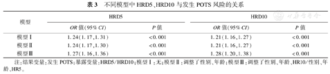 注:结果变量:发生POTS;暴露变量:HRD5/HRD10;模型Ⅰ:无;模型Ⅱ:调整了性别、年龄;模型Ⅲ:调整了性别、年龄、HR10/性别、年龄、HR5。