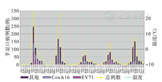 我院2014年1月至2018年12月间,共有4 611例患儿进行了手足口病病原检测。1 638例(35.52%)测试样品至少一种手足口病相关病原体阳性,其中非EV71非CoxA16型肠道病毒阳性率最高,1 091例(66.60%),而EV71及CoxA16型肠道病毒阳性分别为314例(19.17%)及233例(14.22%)。手足口病发病例数及病原分布与平均温度的关系见图2。