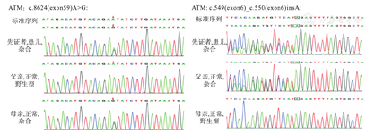 辅助检查:血常规未见明显异常,甲胎蛋白10 μg/L(正常范围0~6.6 μg/L);血清IgG 0.24 g/L(正常范围1~4.2 g/L),腹部及肾上腺彩超均未见异常,正常视频脑电图,头颅MRI+弥散未见异常。全外显子测序分析发现共济失调毛细血管扩张基因存在两个杂合基因突变,其一为错义突变chr11:108218045;c.8624(exon59)A>G;p.N2875s(p.Asn2875Ser)(NM-000051),患儿为该杂合突变型,其父亲为正常野生型,母亲为正常杂合型;基因突变其二为插入突变chr11:108114723-108114733;c.549(exon6)-c.550(exon6)insA;p.R184Kfs*6(P.Arg184Lysfs*6)(NM-000051),患儿为杂合突变型,其父亲为正常杂合型,母亲为野生型。具体基因结果如图1所示,根据基因结果,明确诊断为AT。