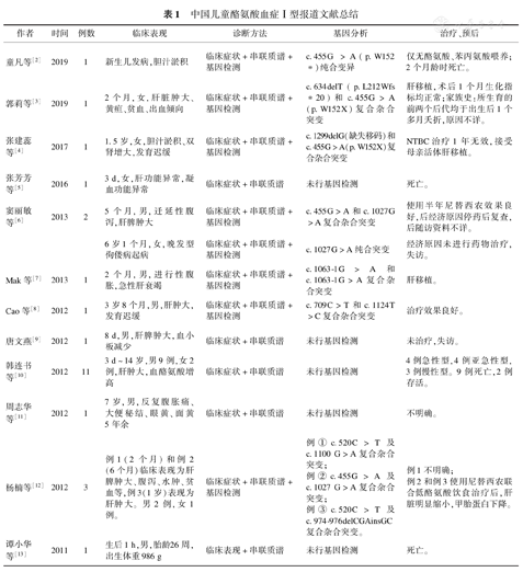 | 郭莉等[3] | 2019 | 1 | 2个月,女,肝脏肿大、黄疸、贫血、出血倾向 | 临床症状+串联质谱+基因检测 | c.634delT(p.L212Wfs*20)和c.455G>A(p.W152X)复合杂合突变 | 肝移植,术后1个月生化指标均正常;家族史:所生育的前两个后代均于出生后1个多月夭折,原因不详。 |