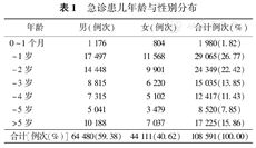 2016年10月1日至2018年9月30日,儿科急诊共接诊患儿108 591例次,其中男64 480(59.38%)例次,女44 111(40.62%)例次,男孩多于女孩,比例为1.46∶1。患儿年龄范围0~17岁,中位年龄11(23,48)个月,年龄分布以5岁以内为主,共913 66例次(84.14%),见表1。