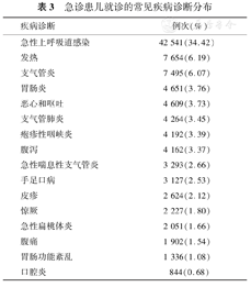 儿科急诊疾病谱具有鲜明的专科特色,疾病种类构成相对于成人急诊区别很大,受环境、天气等外在因素影响大,起病急骤、变化迅速、处理黄金"窗口期"较短较少、风险高,需要儿科急诊医护人员及时准确地把握病情,否则会延误抢救时机[1]。根据上述特点,在临床工作中要对儿科急诊病例做出精准判断,除了需要接诊医护人员具有扎实的专业技能,还需要通过对大量临床病例进行分析,进而了解儿科急诊病例的分布情况,同时在物品准备、人力配置、工作流程设计等方面也要根据实际情况进行科学决策并做好相关预案。目前,国外儿科急诊方面的研究多集中在具体急危重症病例的探讨上[2,3],缺少儿科急诊发病率及病种分布的宏观分析,而国内仅有单一危急病例的研究及对某些局部区域内急诊病例的统计分析[1,4]。