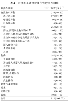 2016年10月1日至2018年9月30日,儿科急诊共接诊意外伤害患儿911例,占患儿总数的0.84%,儿童意外伤害前3位分别为自然腔口异物(370例,40.60%),中毒(264例,28.98%),创伤(147例,16.14%),具体构成见表4。