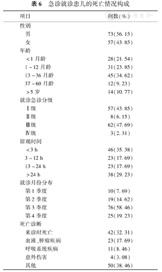 本文讨论时间段内,总共死亡130例,病死率为0.12%(130/108 591例)。占比最多的是来诊时死亡的患儿,到达急诊科就已死亡的42例患儿大部分具有慢性病基础,多次就诊均不能根治,家属在患儿死亡后来院处理后事。由于患儿家属往往未携带相关病史资料,所以未能准确统计先天性疾病所占比例和具体构成。