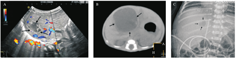 A.超声:肝脏内混合回声包块,内见散在光带回声,囊性包块及周边内部及周边未见血流信号;B.X线:右腹肝区可见囊状透亮影;C.CT:肝内见一巨大低密度灶。