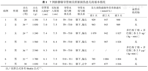 2015年1月1日至2019年12月31日,共1 721例患儿在入住新生儿科后成功进行UVC置管术,共7例(0.41%)患儿在UVC置管术后发生肝脏损伤。7例患儿均为早产儿,其中男5例,女2例;出生胎龄29~36+1周,<32周5例;出生体重1 030~2 540 g,<1 500 g 4例。与非发生肝脏损伤组比较,出生胎龄[(31.12±2.64)周比(30.62±2.75)周,t=0.480,P=0.324]和出生体重[(1 493±525)g比(1 374±473)g,t=0.664,P=0.266]差异均无统计学意义。