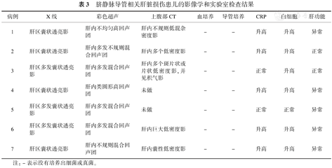 | 3 | 肝区多发囊状透亮影 | 肝内多发混合回声团 | 肝内多个斑片状或片状低密度影,并见积气影 | - | - | 正常 | 升高 | 正常 |