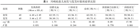 | 组别 | 例数 | 发热热程(Mean±SD,d) | 结膜充血[例(%)] | 口唇改变[例(%)] | 皮疹[例(%)] | 颈部淋巴结肿大[例(%)] | 四肢改变[例(%)] |