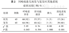 川崎病患儿初发与复发时的主要临床症状相似,而复发时热程0~13 d [(5.66±2.37)d]较初发时热程1~7 d[(6.69±2.85)d]短,可推断复发时患儿家属的就医意识增强,对患儿的及时治疗与改善预后起重要帮助。复发患儿累及其他系统症状的发生率较初发增加,其中呼吸道异常与消化道症状较为多见,且初发时与复发时发生率差异有统计学意义,与姚晓利和张静[15]的报道一致。由于部分患儿复发时临床症状不完全,且程度较轻,常合并其他系统症状,故临床医生应仔细询问病史,对可疑复发的患儿引起重视,注意与相关其他疾病进行区分,避免误诊、漏诊。