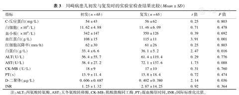 川崎病患儿初发与复发时的实验室检查结果比较(Mean±SD)
