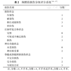 临床常用的评估工具包括美国脊椎损伤学会/国际截瘫学会脊髓功能损伤评分(American Spinal Injury Association/International Medical Society of Paraplegia Impairment Scale,ASIA/IMSOP Impairment Scale)(表1)[1];以及美国脊柱损伤研究小组制定的胸腰段损伤分类及严重程度评分系统(Thoracolumbar Injury Classification and Severity Score System,TLICS)(表2)[16,17]。前者为脊髓损伤评估工具,后者将脊柱损伤形态、韧带损伤状态、脊髓损伤及功能状况相结合,综合评估总体损伤程度,进而决定治疗方案。TLICS应用最大难点在于后纵韧带复合体损伤状态的判断。