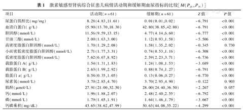与病情缓解期相比,61例激素敏感型肾病综合征患儿在病情活动期尿蛋白/肌酐比值显著升高,血清白蛋白水平显著下降,差异有统计学意义(P均<0.01);血脂指标包括胆固醇、甘油三酯、小而密低密度脂蛋白胆固醇、低密度脂蛋白胆固醇、载脂蛋白A、载脂蛋白B、脂蛋白a,均明显升高,差异有统计学意义(P均<0.01);而血清高密度脂蛋白胆固醇、尿素氮、肌酐变化,差异无统计学意义(P均>0.05);血磷显著升高,血钙水平、钙磷乘积明显下降(P均<0.01)(表1)。