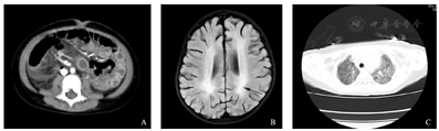 A.腹部增强CT示肠管形态僵硬,肠壁不均匀强化,肠壁增厚,肠间隙模糊;B.患儿头颅磁共振示大脑半球深部脑白质FLAIR序列呈高信号;C.胸部CT肺窗示肺野内散在密度增高影。
