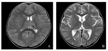 病例2,患儿,男,1岁2个月。因"发热5 d,反复抽搐2次"于2020年10月4日入院。入院查体:T 37 ℃,P 140次/min,R 32次/min,BP 110/90 mmHg,GCS评分9分,双眼凝视,反应差,面色苍白,全身浅表淋巴结未触及肿大,瞳孔等大等圆,直径2 mm,对光反射迟钝,颈软,无抵抗,双肺听诊呼吸音粗,未闻及干湿性啰音,心音中,律齐,心前区未闻及病理性杂音,腹软,未触及包块,肝脾肋下未触及,肢端凉,毛细血管再充盈时间3 s,双侧巴氏征阴性,肌力及肌张力正常。入院后行腰椎穿刺术,脑脊液常规:白细胞2.0×106/L,脑脊液生化:微量总蛋白3 513.3 mg/L,脑脊液病原体高通量测序:HHV-6B。10月5日头颅MRI平扫示:双侧大脑半球皮层及双侧基底节区、背侧丘脑广泛异常信号(图2A)。血尿遗传代谢病筛查阴性。结合患儿HHV-6B感染后出现发热、抽搐、意识障碍等急性脑病症状,脑脊液无细胞数升高、脑脊液蛋白水平升高及以上头颅影像结果,诊断急性坏死性脑病,予更昔洛韦抗病毒,力月西联合德巴金持续泵注止痉,甲泼尼龙大剂量冲击20 mg/(kg·d),连用3 d,人免疫球蛋白1 g/(kg·d),连用2 d。10月13日复查头颅MRI示:双侧丘脑异常信号已不明显,双侧大脑半球皮层及双侧基底节区病变较10月5日MRI明显改善(图2B)。患儿于入院第4天意识转清,未再抽搐,未遗留神经系统后遗症,于入院第11天康复出院。