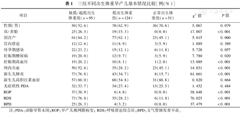 | 项目 | 极低/超低出生体重组(n=95) | 低出生体重组(n=124) | 正常出生体重组(n=51) | χ2值 | P值 |