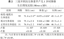 在早产儿矫正年龄1岁时,极低/超低出生体重组身长、体重和头围均落后于正常出生体重组,且身长落后于低出生体重组,差异有统计学意义(P<0.05);低出生体重组和正常出生体重组身长、体重和头围差异均无统计学意义(P>0.05)。见表2。
