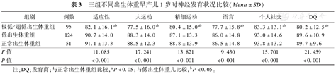 在早产儿矫正年龄1岁时,极低/超低出生体重组适应性、大运动、精细运动、语言、个人社交和DQ均低于低出生体重组和正常出生体重组,差异有统计学意义(P<0.05);低出生体重组和正常出生体重组适应性、大运动、精细运动、语言、个人社交和DQ差异均无统计学意义(P>0.05)。见表3。