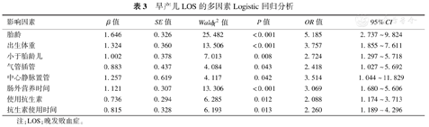 将单因素分析中差异有统计学意义的因素纳入多因素Logistic回归模型,结果显示,胎龄<32周、出生体重<1 500 g、小于胎龄儿、气管插管、中心静脉置管、肠外营养时间≥7 d、使用广谱抗生素、抗生素使用时间≥7 d为早产儿医院获得性LOS的独立危险因素(P<0.05),见表3。